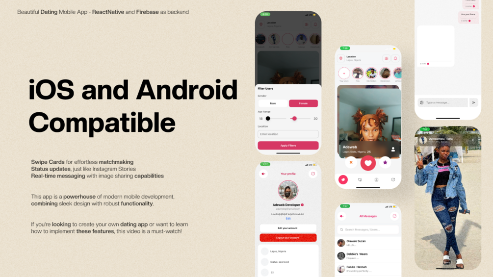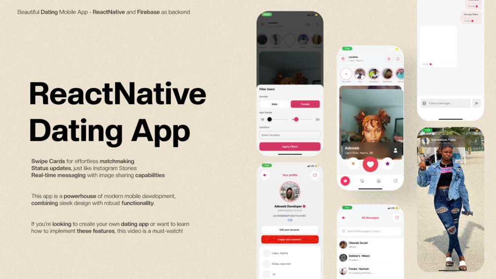 React Native Dating App | Tinder Swipe Cards, Status Features & Messaging